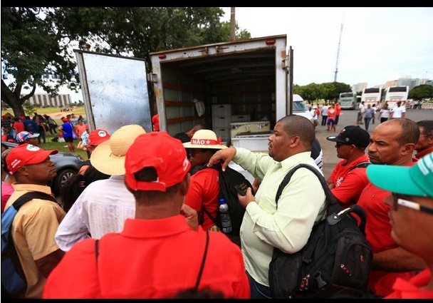 Em barracas montadas, trabalhadores distribuem o kit-manifestação: água e bandeiras. Em caminhões, as marmitas são entregues de graça aos manifestantes. Alguns admitem que receberam R$ 30 a título de “ajuda de custo” para vir a Brasília. Enquanto as quentinhas eram distribuídas para alguns, outros usavam o gramado para assar frango e carne. “Nós fizemos uma vaquinha e estamos aqui para apoiar o governo da Dilma”, garantiu um grupo que veio da Bahia.