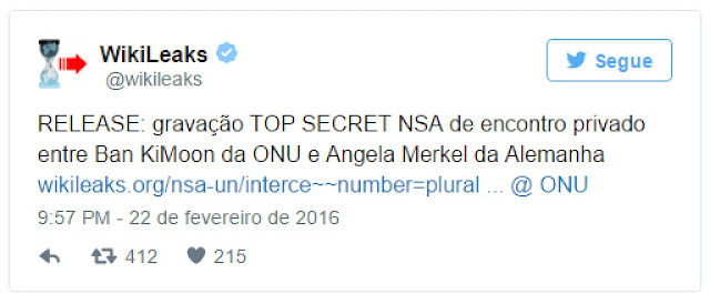 WikiLeaks publica documentos altamente secretos que mostram que a NSA escutas reuniões entre o secretário-geral da ONU, Ban Ki-Moon, ea chanceler alemã Angela Merkel, entre Israel primeiro-ministro Netanyahu eo primeiro-ministro italiano Berlusconi, entre essencial da UE e os ministros do Comércio japonês, discutindo seus comerciais vermelhas linhas secretas nas negociações da OMC, bem como detalhes de um encontro privado entre o então presidente francês, Nicolas Sarkozy, Merkel e Berlusconi.
